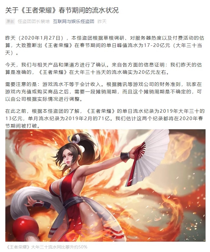 互联网与娱乐怪盗团微信公众号称,经与相关产品和渠道方确认,手游《王者荣耀》在除夕当天的流水为20亿元左右。此前《王者荣耀》的单日流水纪录为2019年大年三十的13亿元,单月流水纪录为2019年2月的71亿,预计这两个纪录都将在2020年春节期间被打破。
