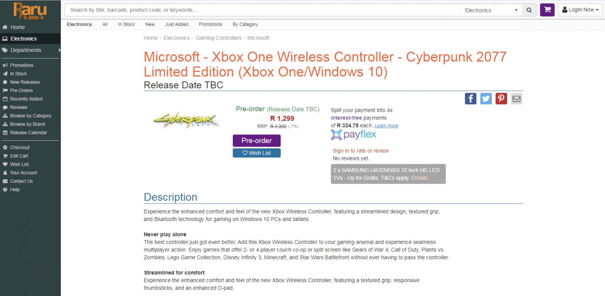 某位Reddit网友表示,南非网络零售商Raru列出了一份《赛博朋克2077》限量版Xbox One手柄的清单。目前,这个网页已经被删除了,但是已经公布的截图显示,网页中并没有出现手柄的样子。 但是却公布出来的价格为1299南非兰特(约合人民币610元),对于一个手柄来说这个价格有点高,但是还是在一个大家能够想象的范围((或者在其他地区可能卖不到那么高的价格)。