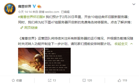 《魔兽世界》怀旧服将于2月20日再开放10组经典怀旧服PvP新服务器,同时还对47组服务器开启新的免费角色转移服务,以下是公告详情——