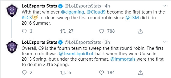 LOL数据官推这么评价C9豪取九连胜:自2016年夏季赛的TSM之后,C9赢下CLG(9-0的战绩),成为了又一支在首轮比赛横扫LCS的队伍。