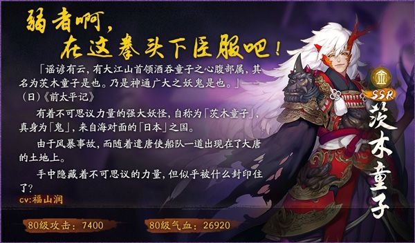 在东瀛的传说中,茨木童子是神通广大的妖鬼,也是大江山首领酒吞童子的心腹部属。这位拥有着不可思议力量的强大妖怪,因一起神秘的风暴事件而与酒吞童子等妖灵登上了遣唐使的船队,并来到了大唐。茨木童子身着金红战甲,过腰的白发随风飘摇,左手妖气萦绕,右臂处却空无一物,似乎是某场大战中被敌人斩下。藐视弱者,爱用铁拳激战群敌的茨木童子,此番在大唐却遭遇了记忆和力量被封印的危机,它能否挥动炼狱豪拳,再度冲破障碍,重获神通?