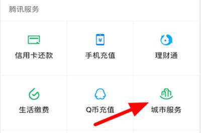 2、点击之后我们便会进入到支付界面,在该界面找到“腾讯服务”,在该栏中找到并点击“城市服务”选项。