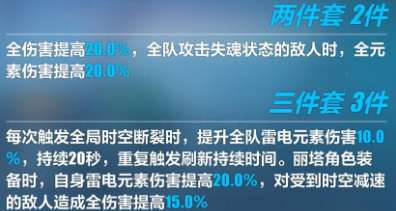 雷电元素伤害提升15%,角色在场下时,全队元素伤害提高15%(唯一生效)