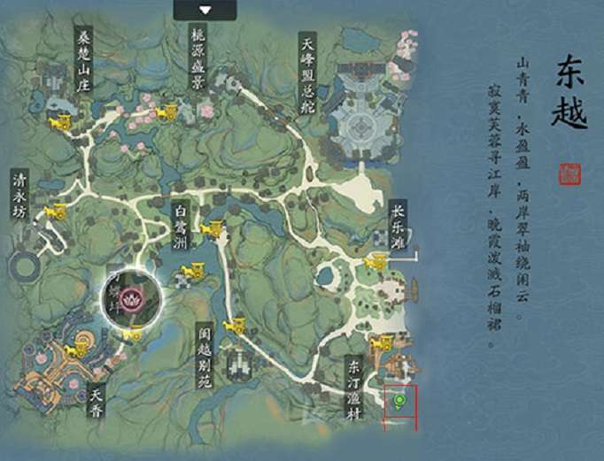 1、游戏中玩家前往东越的地图,具体位置就在右下角,小编为大家标出具体的位置了,玩家到达位置即可看见东汀渔村。