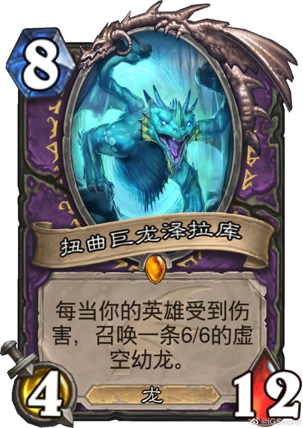 又一张炉石巨龙降临新卡公开:11月29日,职业选手太极剑公布了一张新卡:扭曲巨龙泽拉库,这是一张术士的传说随从卡。