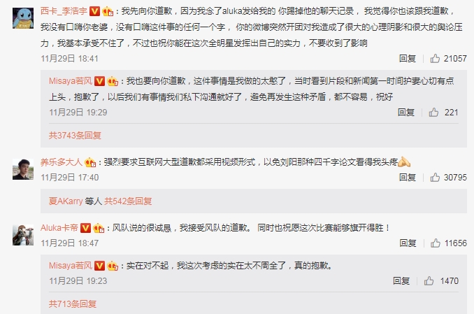 另一位当事人Aluka则表示接受若风的道歉:“风队说的很诚恳,我接受风队的道歉。 同时也祝愿这次比赛能够旗开得胜!”