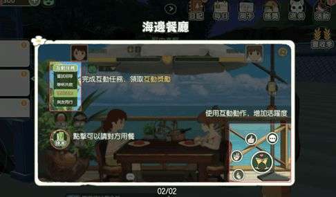 想要在海滨餐厅进行用餐,就需要找到海滨npc晴奈,在晴奈处可以选择拼桌用餐或者包厢用餐,拼桌用餐是随机找到其他玩家一起用餐,包厢用餐则可以邀请指定好友玩家一同用餐。