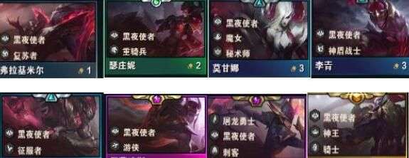 中期可以四黑夜使者搭配双重骑兵,双征服者。如果发牌员比较友好的话那就上六黑夜使者,等到六黑夜使者羁绊成型,我们就要攒钱升八级,这样神王诺克搜到的几率就大很多。后期等来神王诺克,那么这套阵容就成型了,如果经济可以的话,上九级拿千珏组成双游侠,另外千珏的大招也可以更好地保护月男输出,毕竟月男是这套阵容的核心输出位。也可以拿天使组成双征服者,不过不太建议。