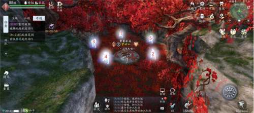 第二个任务需要按照宫→角→羽→徽→商,迅速依次破解机关,如下图箭头所示顺序。破解后拾取宝箱奖励,再回去找柳永。柳永让大家去给他买酒,点击任务自动寻路前去酒馆老板娘处买酒,再回去找柳永,然后柳永会道出答案:是杜鹃岗。