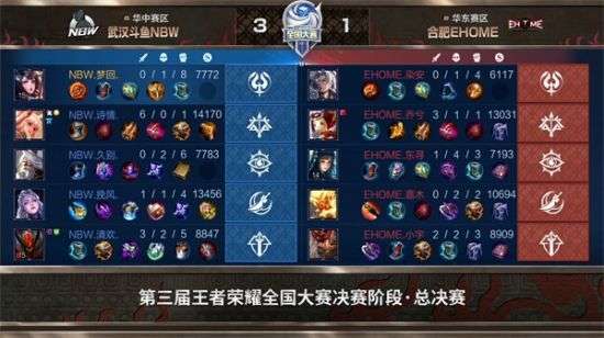 2021年7月18日,第三届王者荣耀全国大赛总决赛在武汉武钢体育中心举行,合肥EHOME、武汉斗鱼NBW上演顶级对抗,双方进行了五局精彩激烈的比拼,最终合肥EHOME获得全国大赛亚军,武汉斗鱼NBW斩获第三届王者荣耀全国大赛总冠军!