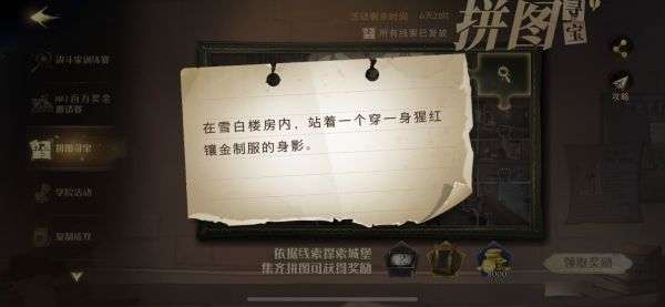 今天哈利波特魔法觉醒手游中给出的10.13拼图线索提示是:在雪白楼房内,站着一个穿一身猩红镶金制服的身影
