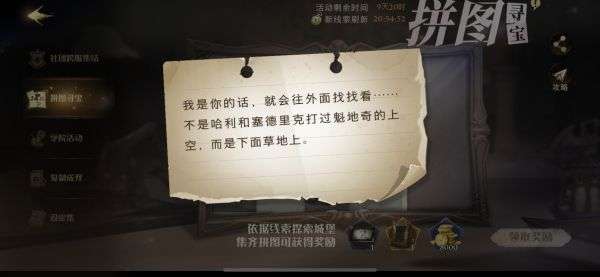 今天哈利波特魔法觉醒手游中给出的10.24拼图线索提示是:我是你的话,就会往外面找找看……不是哈利和塞德里克打过魁地奇的上空,而是下面草地上