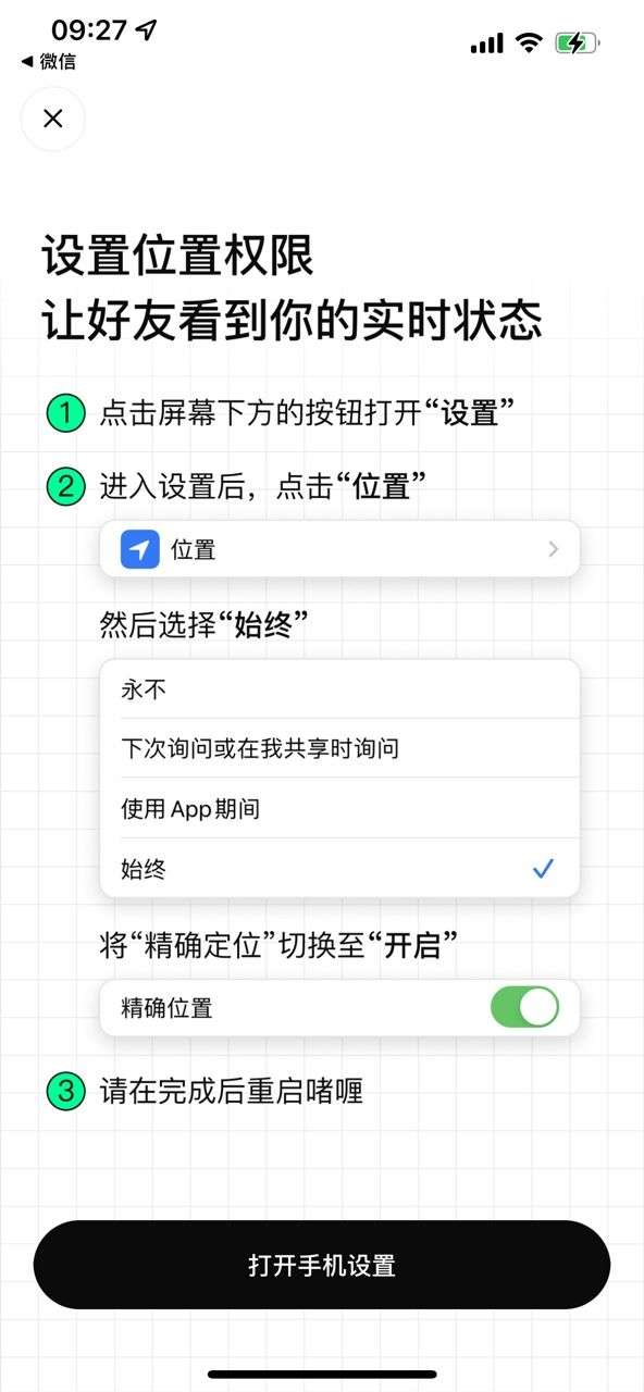 紧接着我们就可以看到相关的操作提示,就是上图中的内容,点击屏幕最下方的打开手机设置,然后找到位置这个选项,选了始终之后就可以开启精选位置了,将后面的按钮点击变成绿色就可以了,完成这一些列操作之后建议大家关闭app然后重启。