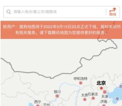 致用户:搜狗地图将于2022年5月15日23点正式下线,届时关闭所有相关服务。请下载腾讯地图为您提供更好的服务。
