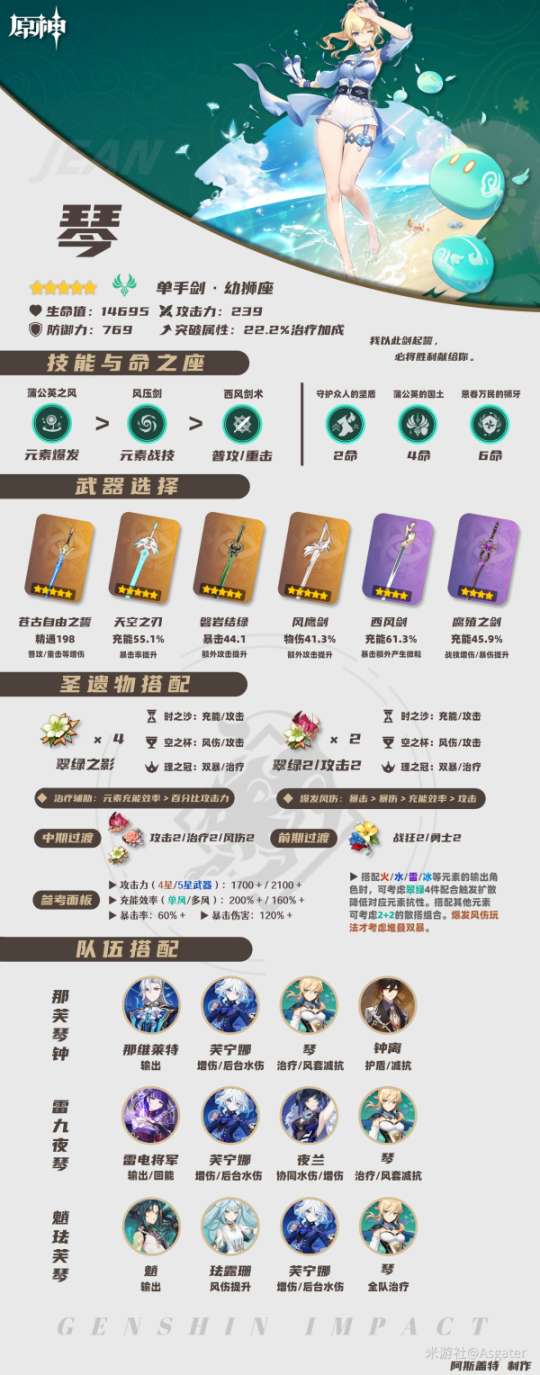 ③ 琴主要利用其具有瞬间全体回复的元素爆发来加入需要治疗的队伍中,在解锁2命后可加入以普攻作为输出手段的队伍(如高命纯火宵宫、三风流浪者队伍等)。