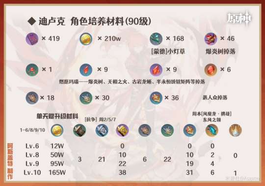 ② 迪卢克需要3个技能全部升级,圣遗物套装优先魔女4件。