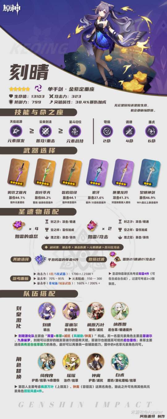③ 刻晴自身没有“精通转模”机制,使得她并不太需要专门堆叠大量的元素精通(自身精通阈值并不高),所以主词条优选攻击沙、雷伤杯、暴击/暴伤头冠。