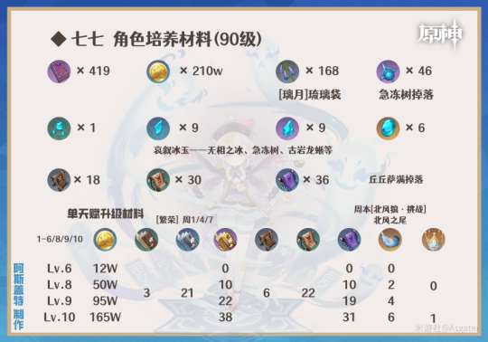 ① 七七主要堆叠的属性是攻击力、元素充能效率,提高自身治疗量和优化大招循环。