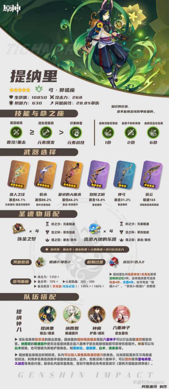 ② 提纳里的暴击率尤为重要,伤害主要来源于重击、元素爆发,即使解锁1命,也推荐尽可能将暴击率叠至70%以上,以提高整体输出期望,在选择武器时可优先双暴武器。