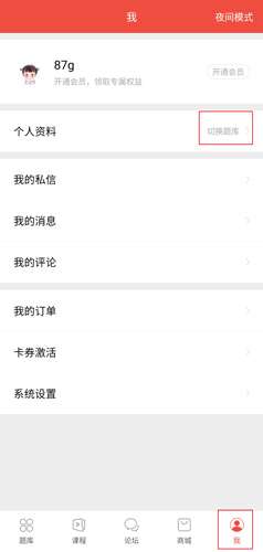 1、用户在我页面中点击个人资料-切换题库按钮;