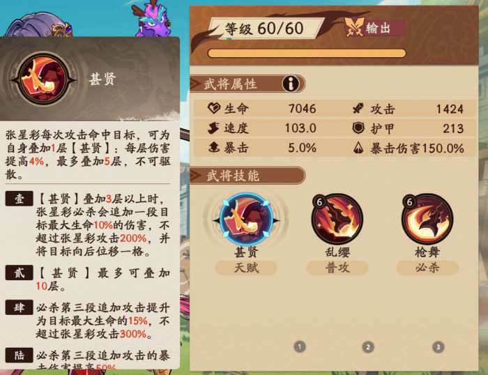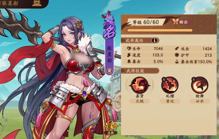 张星彩是名将稀有度的输出定位角色,隶属于蜀国,初始就有150%的暴击伤害加成,在局内的定位里面属于是前排战士类型的输出,主打的是近战。虽然有一定的输出力,但是她的打击方向均为前排单体,如果遇上前排坦克加法师的阵容就比较难过墙。