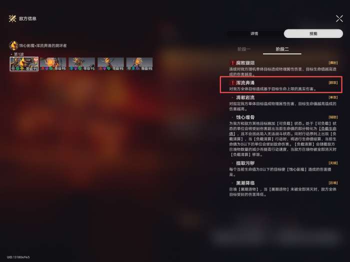 4、一阶段转二阶段BOSS新增一个大招(浑流奔涌),留生存位大招(风堇、灵砂、腾荒、白露等),在BOSS第一次攻击之后,释放大招【浑流奔涌】之前插队治疗避免角色[负载生命值]超过10000(成就需要8000以内)