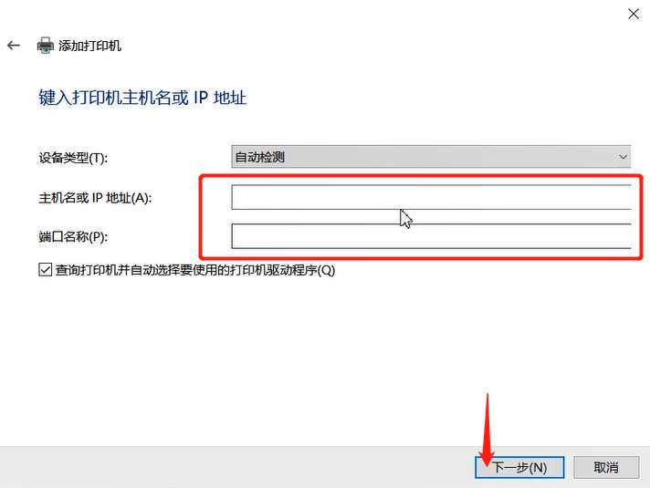 在窗口中输入ip地址、端口,点击下一步,就能成功添加打印机了。