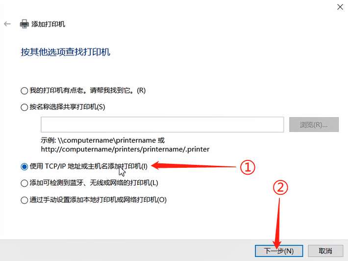 接着点击使用tcp/ip地址添加打印机,下一步。