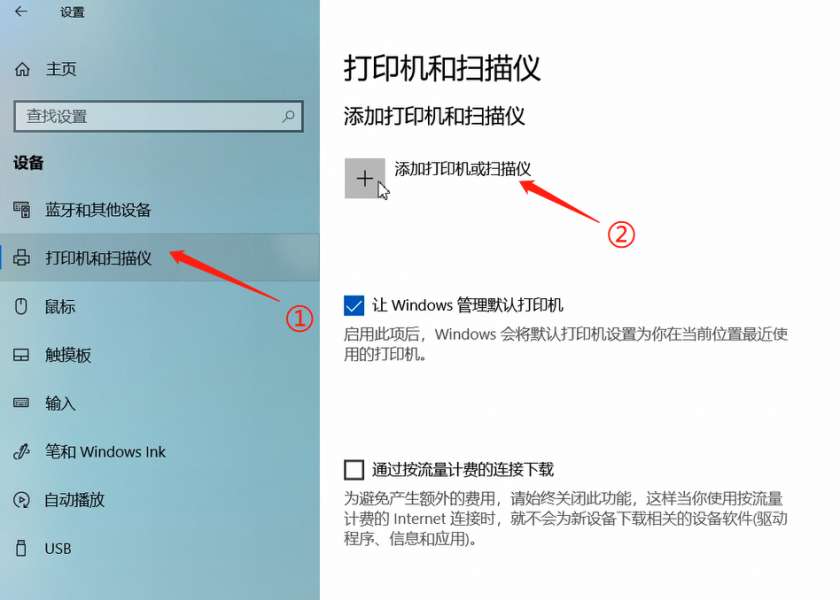 点击打印机和扫描仪,选择添加打印机和扫描仪,