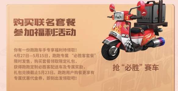4月27日至5月15日,全国1600余家必胜客门店将同步上架数款定制“跑跑卡丁车冠名套餐”。