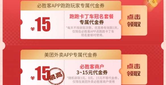 活动期间,车友们登陆跑跑卡丁车手游活动中心进入必胜客联动主题页,就能领取跑跑玩家专属的15元套餐优惠券,每日不限领取次数,以惊喜低价畅享美食!您还可以选择登陆必胜客APP及美团外卖APP领取更多联动超值代金券哦!