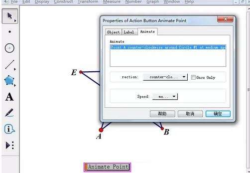 制作动画按钮。选择“移动箭头工具”,选中动点A,点击上方的“编辑”菜单,在弹出的下拉菜单选择“操作类按钮”——“动画”选项,在弹出的对话框点击“确定”按钮(如下图所示),这样就制作好了动画按钮。