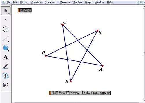 绘制五角星。画一个圆,并且在圆上另外任意取一点,分别标记为点O和点A。 双击圆心O(将其标记为旋转中心),选中点A,点“变换→旋转”,输入72°,点“旋转”。 将得到的点标记为点B,单击选中点B,再点“变换→旋转”,72°。总共旋转4次,并依次标记为B、C、D、E点。选中圆和圆心O,点“显示→隐藏对象”,一个五角星就绘制完成了。