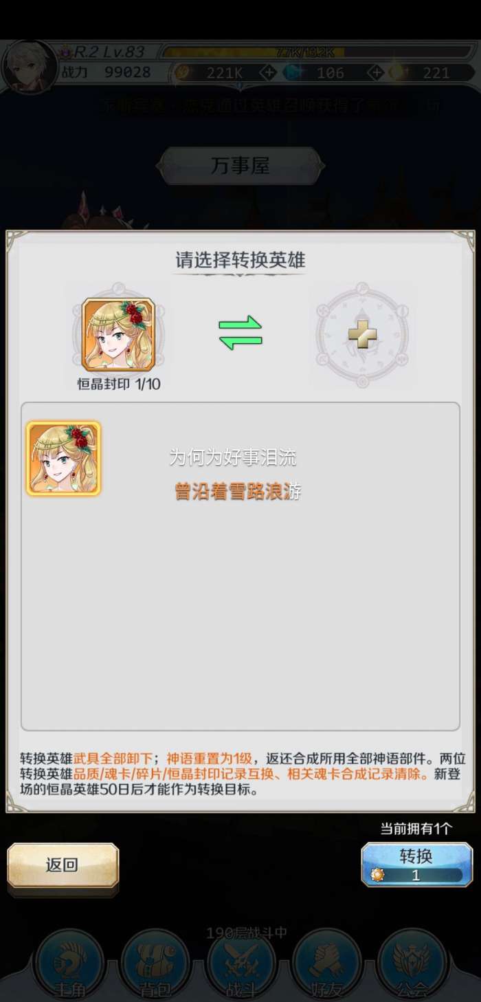 你要有别的卡才可以转换,封印1是你已经开了一次这个人物的恒晶封印了,你需要两个英雄进行品质的对换,下面是你已经抽到的小锅次数。顺便说一下,不懂这个东西的话不推荐用掉。