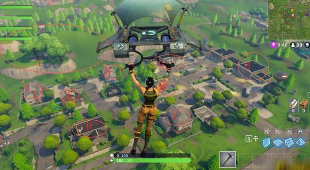 建议你落到屋顶,并且用你手中的锄头为自己砸出一条路!屋顶中也常常隐藏着宝箱,打开看看,测试一下自己的欧气吧。