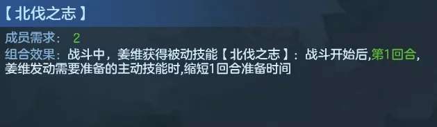 组合技第一回合加快了姜维的节奏,不出意外的情况下将会在2、5、8回合发动专属技能,如果没有组合技加持就会少放一次技能。两位大C凑在一起所造成的输出量会碾压大部份的主动技能队伍,在持久战中会具备输出优势,加上地载阵也能保证队伍前2回合能够安全输出。