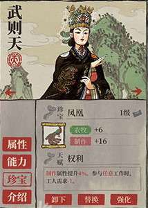 目前最为适合武则天的珍宝,应该就是这个凤凰了,算是专属珍宝,因为武则天装备之后,直接就可以减少两个工人,所以实际的表现很是不错。在建造或者升级建筑的时候,有的时候需要三个工人,而武则天只需要一个就可以,能够以一抵三,可以说是效果拔群了。