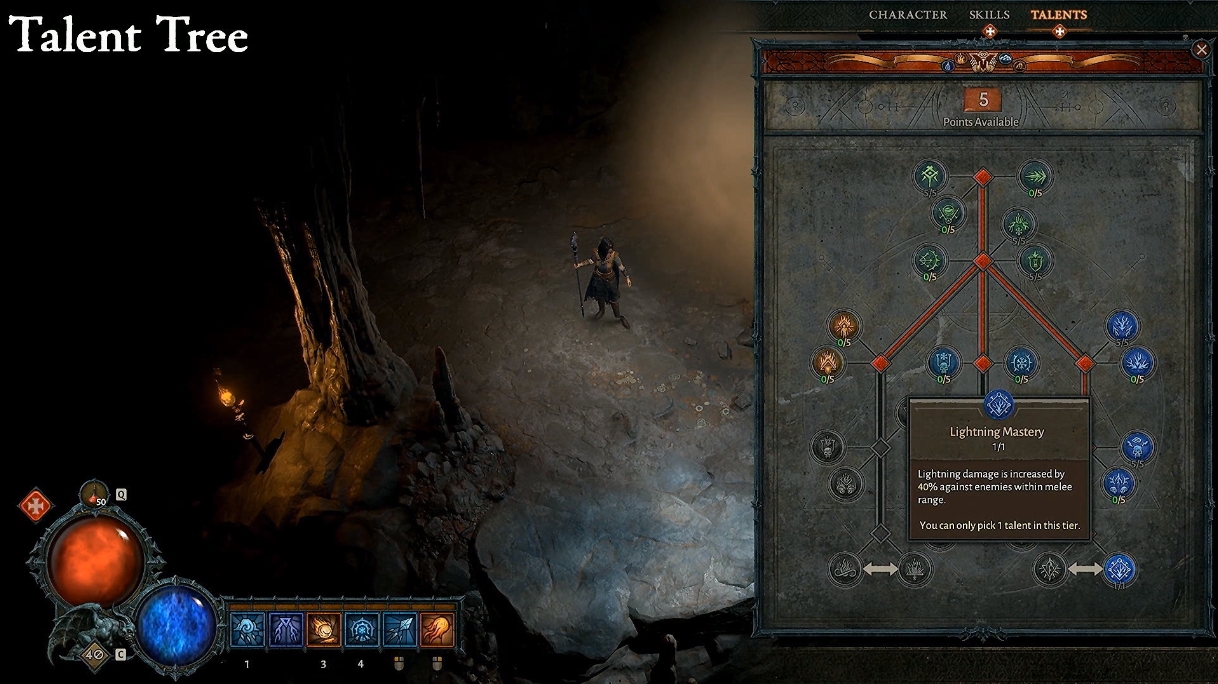 【技能点】将通过玩家提升角色等级来获得,可以用来点亮新技能或提升现有技能的等级。每个不同的职业都有自己独特的【天赋树】系统,越靠近天赋树下方的天赋能力也会越强,玩家可以根据自己的玩法喜好来选择合适的天赋点法。