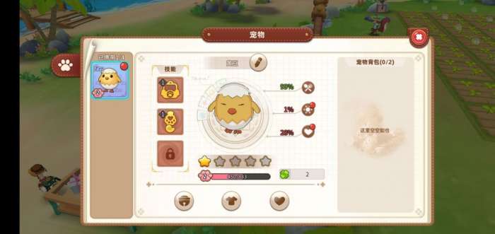 第一只免费宠物获得(一直收鸡蛋有概率获得)获得宠物后,去大厅宠物商店,用2000金币买10包宠物饲料,足以把宠物好感度提高到2级(因为好感度2级解锁技能拾取和宠物背包)从此不用管宠物,也饿不死(前期没钱就别随便养)