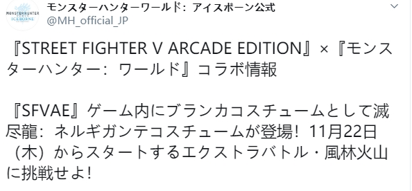 详细来说,本次《街头霸王5:街机版》与《怪物猎人:世界》的联动活动将于2019年11月22日正式开启,持续至2019年12月20日。
