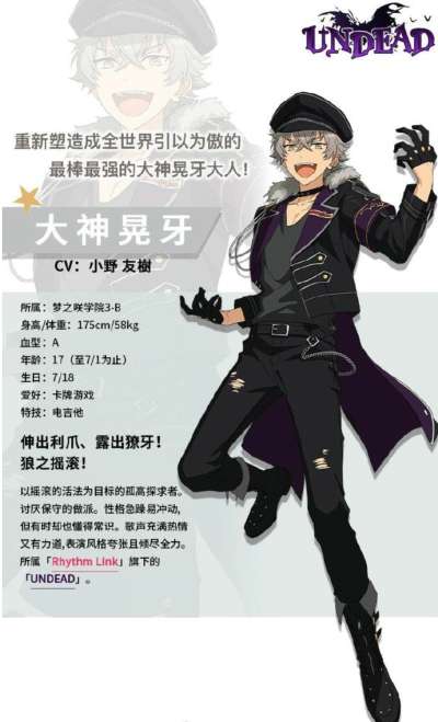 大神晃牙是以摇滚的活法为目标的孤高探求者,同时他十分讨厌保守的做派。他对摇滚的追求,也构成了他独特的魅力点之一。目前,大神晃牙所属于Rhythm Link事务所旗下的音乐组合UNDEAD作为一名音乐学员活跃着,并且有一大批欣赏他的摇滚艺术的粉丝。