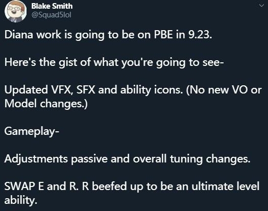 Riot设计师Black Smith在推特宣布,皎月女 神黛安娜的重做将会在9.23版本正式上线后登测试服,并简单说明了大致的改动情况。