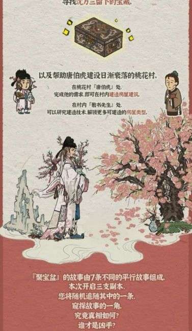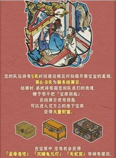 我们有五天时间建设桃花村和进行主线任务。这里有点像剧本杀,我们有可能体验完三个故事只能找到聚宝盆的部分秘密。