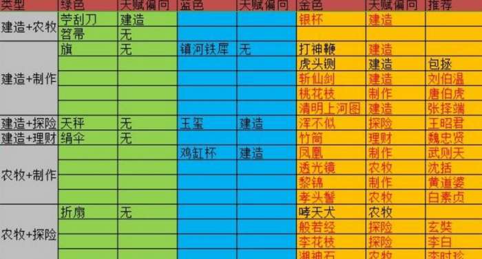珍宝也是类似的道理,珍宝有二维属性,但天赋不同,例如斩仙剑和桃花枝都是建造+制作,但斩仙剑偏建造,桃花枝偏制作。我们需要根据人物的偏向选择珍宝的偏向。