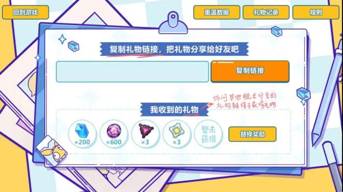 活动期间,舰长还可以点击报告中的【分享礼物】链接,将这份心情继续传递下去~首次分享礼物链接的舰长,将可以获得100水晶的奖励!