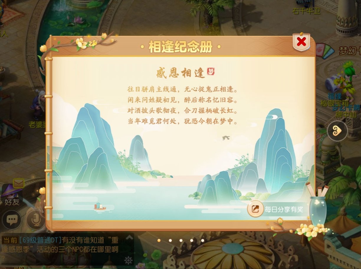 在茫茫人海中,谁曾与玩家不离不弃,站在同一战线上?在强大的主线任务战斗面前,是谁与玩家一同并肩迎击劲敌?玩家可以打开感恩相逢纪念册,回顾这份温暖回忆,并将这份温暖传递出去。而《梦幻西游》手游也会在每日为首度分享感恩纪念册的玩家,准备一份好礼,以感谢他们对《梦幻西游》手游的支持。