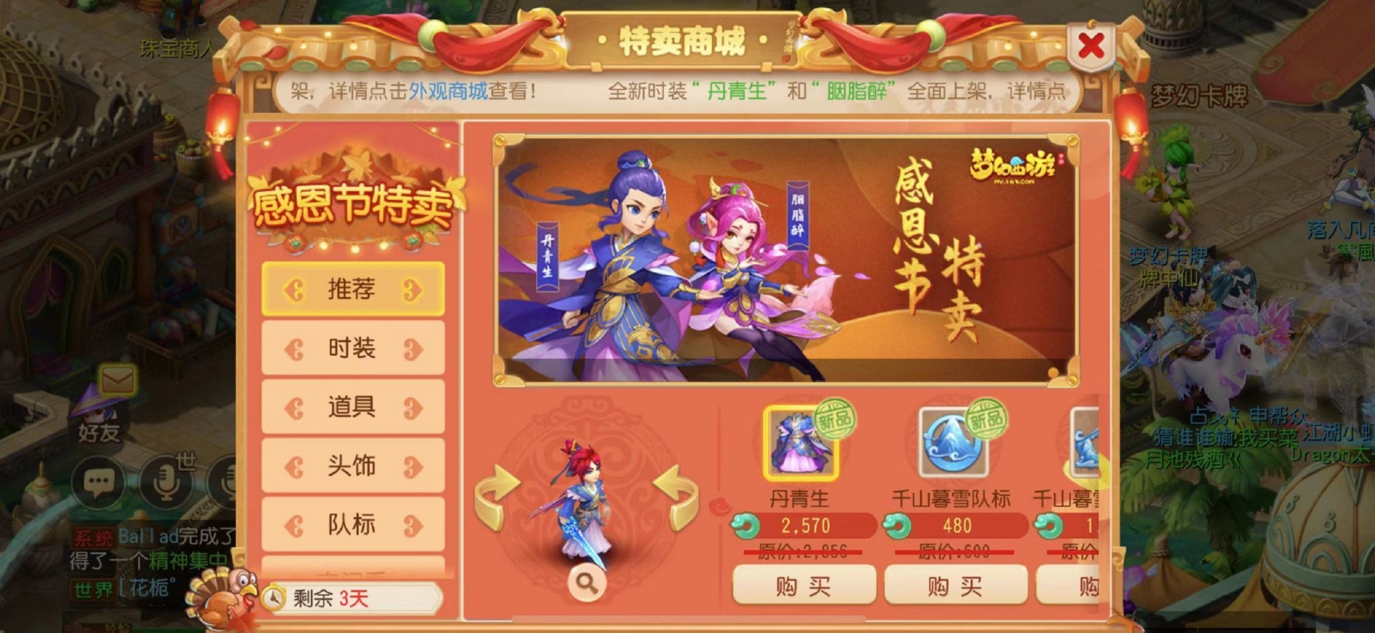 此次节日特卖商城不仅包含了海量折扣道具,更以限时折扣价上线了新时装丹青生(男)和胭脂醉(女),以及限定头饰幸运火鸡、千山暮雪系列队标、空间秀、头像框和空间挂件。玩家可以根据所需添置新衣,或是戴上节日气息浓郁的火鸡头饰,感受一番浓郁节日氛围。