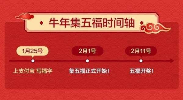 支付宝官宣集五福将在2月1日上线,在25日提前开放了“写福字”玩法,上支付宝搜「写福字」,就可以亲手写下福字。每天前50万个福字可选择免费打印包邮到家,人虽未必返乡,祝福一定到场!上传晒福字,你写的福还有可能出现在五福的彩蛋卡上!