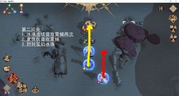 如上图,封铃笙贴脸弄死手持钢板的雷属性小怪,反正封铃笙接下来不会受伤,掉不掉血无所谓,这么做是为了留右下的位置给冰璃。