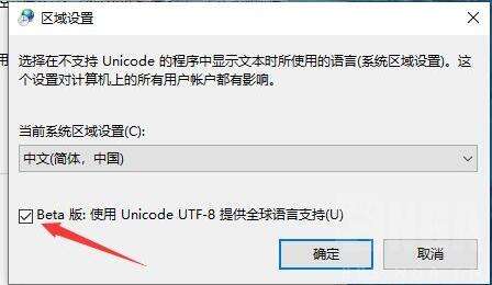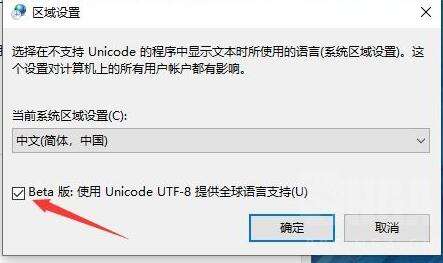 3、在区域设置中勾选"Beta版:使用Unicode UTF-8提供全球语言支持”。